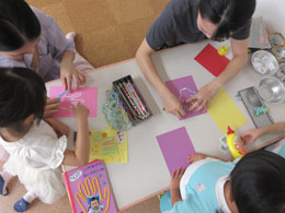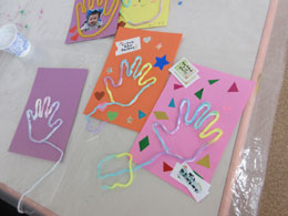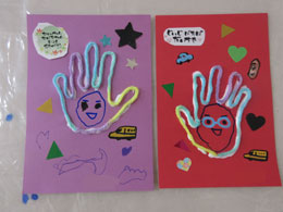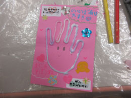 「敬老の日」イベントとして自分のおじいちゃん、おばあちゃんへ可愛い手形のプレゼント製作をしました。鉛筆で手の形をなぞり、その線にボンドをつけて、好きな色の毛糸をくっつけたら完成!まわりにメッセージやイラストを描いて可愛く仕上げました。