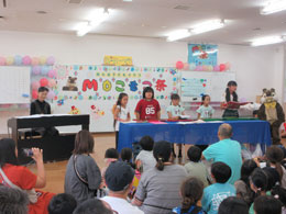 毎年8月に「夏祭り」として開催してきたお祭りですが、近年暑さが増し、来場される方々の熱中症予防対策のため、今年は「MOこもこ祭」と名前を変えて9月に開催することに致しました。楽しみにしていた子ども達も多く、たくさんの人が来場してくれました。オープニングでは「音楽だいすきクラブ」の歌と合奏で華やかにスタートです!