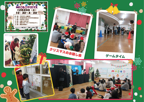 今年も「MOこもこクリスマス」を行いました。午前中はみんなでツリーにオーナメントやガラスにスノーパウダーで素敵に飾り付け!そしてまちだ語り手の会によるクリスマスのお話し会もありました。午後は玉大生によるクリスマスゲームタイムや人形劇グループぱぴぷペポンによる楽しい人形劇!音楽だいすきクラブによるクリスマスコンサートと盛りだくさん。最後に南大谷駐在所のおまわりさんがサンタになって登場し、防犯のお話しがちゃんと聞けたお友達に素敵なプレゼントをくださいました。MOこもこに遊びに来た子ども達は1日を通して楽しく過ごすことができたようです。来年もお楽しみに!