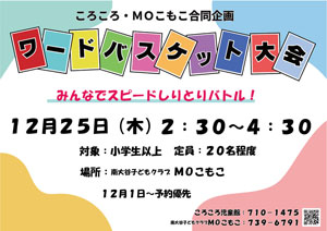 姉妹館のころころ児童館とMOこもこ合同企画で今年はカードゲーム「ワードバスケット」をして遊びました!ルールはしりとりと一緒!頭の文字と終わりの文字でワードを作り、早く手持ちのカードがなくなれば勝ち!スピード勝負のゲームにドキドキ盛り上がりました。後半は先生も加わりみんなで楽しみました。