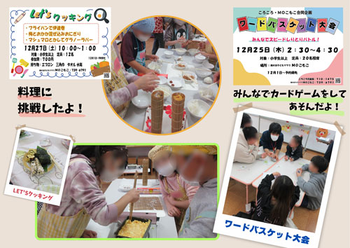 今回のLet’sクッキングはお正月にピッタリの「フライパンで簡単伊達巻」と「梅とおかかのおむすび」「手軽に作れるグラノーラーバー」の3種類を作りました。参加した子ども達はお料理の大好きな子ども達なので講師の方に教えていただきながら、楽しくお料理することが出来ました。そしてもっと楽しみなのは食べること!自分で作った物を食べている時の子ども達はとても幸せそうでした。次回はひなまつりで「ちらし寿司」を作る予定です。お楽しみに!