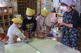 もちばな作りから参加した方は、みんなで粉をこねて丸め、児童館の園庭にある梅の剪定枝に刺して焼き、みたらしタレをつけて食べました。