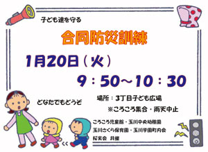 今回は、玉川中央幼稚園・玉川さくら保育園・ことりの森保育園・桜実会・町内会・ころころ児童館の合同で、3丁目子ども広場への避難訓練を行いました。