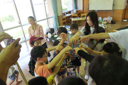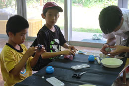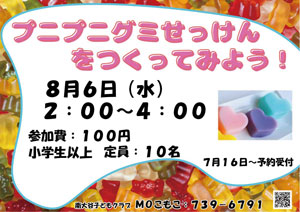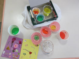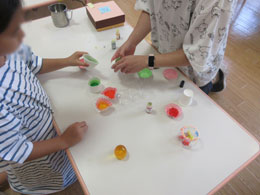 液体せっけんとゼラチンを混ぜ、好きな色に着色をして固めるだけで簡単にできます。子どもたちは好きな型にせっけん液を流し入れ、冷やし硬め、完成すると触感を楽しみながら嬉しそうに持ち帰りました。