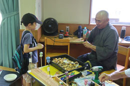 恒例になっているヒョウタンを使った工作を教えにひょうたん大王がいらして下さいました。今回は笛作りです。ヒョウタンの実に和紙を貼り付けた物に笛とヒモを取り付けてストラップ型のヒョウタンのホイッスルを作りました。