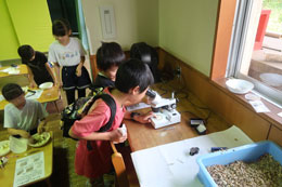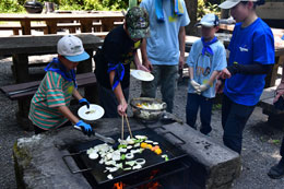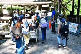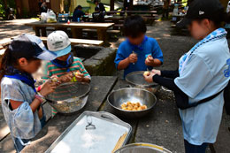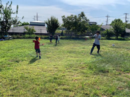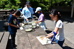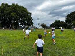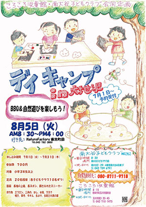 ころころ児童館と合同企画で毎年「デイキャンプ」を行っています。今年も大地沢にあるネイチャーファクトリー東京町田へ行き、お昼には、皆でバーベキューをしたり、自由時間には川でカニやカエル、虫などを探したり、竹とんぼづくりなどをして1日自然の中でのびのびと遊びました。