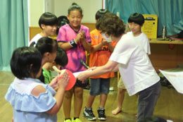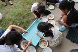 最初はフリータイムで思いきり水をかけ合い、笑い声でいっぱいになりました。後半は毎年恒例のチーム戦です。腕輪をつけてのバトルから始まり、チームの陣地に的を置いた陣取り合戦も行いました。高学年の子は素早い動きで敵陣に切り込み、迫力ある戦いを見せてくれました。