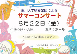 昨年の小春祭でご縁ができた「玉川大学吹奏楽団」がこの夏、ころころ児童館でコンサートをしてくれました。
