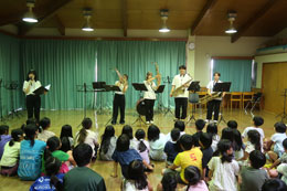 最初に各楽器を紹介しながら特徴をとらえた曲を披露してくれ、その後合奏で子どももみんな聞き馴染みのある、ドラえもんやジブリ、ディズニーの曲を演奏してくれました。