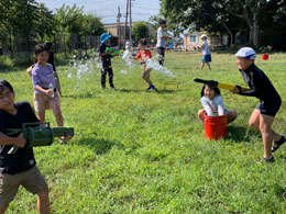 終盤には、暑さからバケツの水をかぶる子もいて、みんなびしょぬれになりながら大盛り上がり。水でっぽうあそびならではの夏らしいひとときを楽しみました。