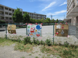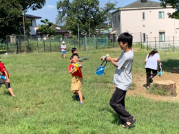 今年も夏休み期間に水鉄砲合戦を行いました。MOこもこの庭と4号棟前広場を使って前半はチーム戦で各チームの的を狙います。後半は自由遊び!みんな自分の水鉄砲を持って集まり、びしょびしょに濡れて、思い切り遊びました。