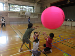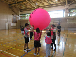 年に4回近隣の小学校の体育館をお借りして出張児童館を行っています。今回は南大谷小学校の体育館で行いました。普段児童館ではできないダイナミックな遊びを広い体育館を使って2時間思い切り遊びます。玉川大学の学生さんが考えてくれた「しっぽとりゲーム」や巨大なボールを使って行うキンボールというスポーツをやりました。低学年から中学生までが参加してゲームも盛り上がりました。