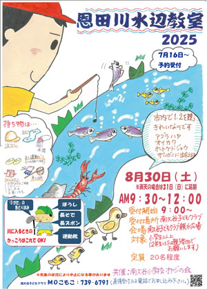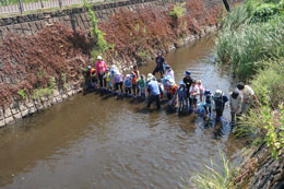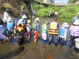 毎年恒例「恩田川水辺教室」を今年も行いました。今年は猛暑で雨も少なく、川の水位はいつもより少なめでしたが、魚やザリガニはいつものようにたくさん見ることができ、元気いっぱい泳いでいました!今年は低学年がMOこもこの近くの親水広場から下流に歩き、高学年が南大谷小学校の近くから親水広場まで下流から上流へ歩いていきました。途中滝のように流れが早い場所があったり、腰まで浸かるくらいの深い場所があったりとスリル満点!子どもたちはライフジャケットを身につけ、川にいる生き物を探しながら進みました。低学年と高学年が川幅が広い場所で落合い、みんなで網を並べて追い込み漁も行いました!