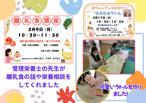 「離乳食ってどうやって作るの?」「どのくらいの固さすればいいの?」はじめの子育てはわからないことだらけ‥そんなママ達の声を講座にしてみました。離乳食の開始と進め方、食べさせ方等、栄養士の資格を持つ講師が色々教えてくれました。また、子どもの栄養面や食べず嫌い、歩き食べ等、他に困っていることもアドバイスしてもらい、ママ達にとってとてもためになる講座になったようです。