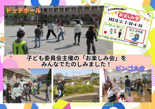 子ども委員会が主催するのお楽しみ会を行いました。企画を考えるところから当日の進行まで頑張りました。最初は外でドッヂボールと逃走中鬼ごっこをして元気いっぱい体を動かして遊びました。その後は館内でビンゴ大会!幼児から大人までが参加し、景品をもらうと喜んで持って帰りました。
