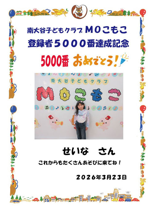 南大谷子どもクラブMOこもこ 登録者5000番達成