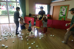 土曜日のイベントでは、普段のキッズよりも運動をたっぷり楽しめるプログラムを用意しています。今月は運動会シーズンに合わせて、新聞紙の玉を使った玉入れ対決をしました。みんなで夢中になってかごをめがけて投げる姿がとても印象的でした。