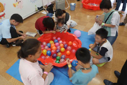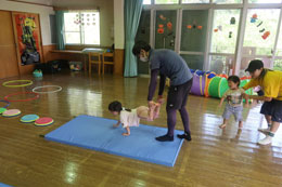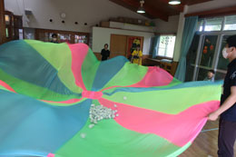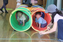 そのほかにも、大きなパラバルーンをみんなでバサバサ動かしたり、膨らませて中に入ってお家を作ったりと大盛り上がり。最後はサーキット遊びに挑戦しました。ジャンプやトンネルくぐり、マットでのでんぐり返し、手押し車などを通して、遊びながら体幹やバランス感覚を育むことができました。