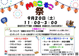 毎年8月に「夏祭り」として開催してきたお祭りですが、近年暑さが増し、来場される方々の熱中症予防対策のため、今年は「MOこもこ祭」と名前を変えて9月に開催することに致しました。楽しみにしていた子ども達も多く、たくさんの人が来場してくれました。オープニングでは「音楽だいすきクラブ」の歌と合奏で華やかにスタートです!
