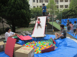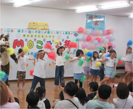 お祭りが始まると館内にはボウリング、さかなつり、ヨーヨーつり、うちわ作り等の遊びのコーナー!また、おばけ屋敷は今年も大人気でした。ウォータースライダーは少し涼しくなってしまったので、ボールプールすべり台に変更!着替えがなくても楽しめたと好評でした。4号棟前広場の模擬店では子ども達の好きなかき氷やフランクフルト、焼きそば、からあげ等のお店がいっぱい!嬉しそうにお買い物をして食べていました。エンディングではころころ学童保育クラブのダンス発表!MOこもこのマスコットキャラクターリスのリッキーも一緒に踊って盛り上がりました。途中パラパラ雨が落ちてきましたが子ども達はお構いなしに楽しんでいました。色々お手伝いしてくださった近隣の方々本当に感謝です。今年も皆さんの協力のおかげで事故や怪我もなく、無事終了することができました。また、来年の「MOこもこ祭」もお楽しみに!