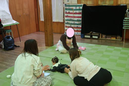 乳酸菌飲料の容器に両面テープを貼り、もふもふの毛糸を巻き付けていきます。そして毛糸のポンポンを2つ付けて出来上がり!子ども達はママの近くにいる子もいれば、どんどん動き出す子はスタッフが見守り、子育て中のママ同士おしゃべりしながら楽しく製作に取り組んでいました。次回は何を作るかな?お楽しみに!