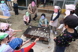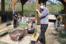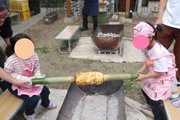 今年は幼児の参加も多く、はじめは「こんなのでできるのかな?」と不安そうな様子も見られましたが、たき火の上で竹をくるくる回しながら、みんなで協力して立派なバームクーヘンを焼き上げることができました。焼いている最中は「顔があついよ~」という子もいましたが、最後は出来上がったバームクーヘンを美味しく食べ、ごほうびマシュマロもあり、笑顔あふれる時間となりました。