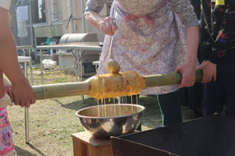 ぬぼこ山で採ってきた竹を適度な長さに切り、節を軽く落として使います。生地を巻きつける前には竹を軽く炙り、油分による独特の風味を和らげることで、より美味しく仕上がるようにしています。