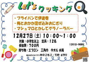 今回のLet’sクッキングはお正月にピッタリの「フライパンで簡単伊達巻」と「梅とおかかのおむすび」「手軽に作れるグラノーラーバー」の3種類を作りました。参加した子ども達はお料理の大好きな子ども達なので講師の方に教えていただきながら、楽しくお料理することが出来ました。そしてもっと楽しみなのは食べること!自分で作った物を食べている時の子ども達はとても幸せそうでした。次回はひなまつりで「ちらし寿司」を作る予定です。お楽しみに!